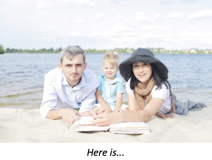 • 話者が自分が居る空間を意識し「ここです」と表現したい場合、Here is…
