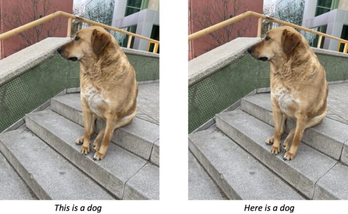 • (話者が「ここに犬が!」と、自分と犬がいる場所を表現)「Here is a dog!」