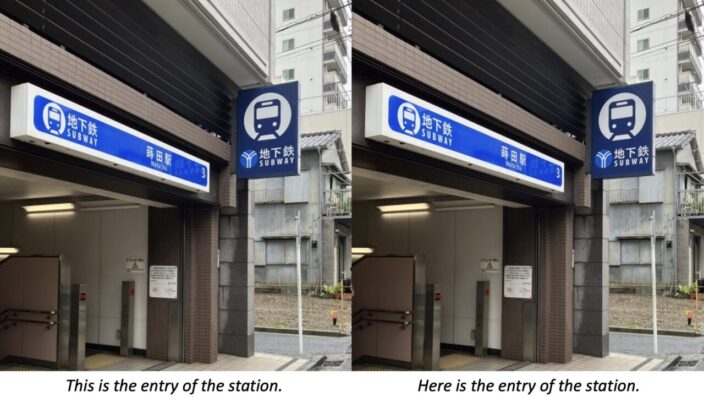 • 話者が入口を指し示し「ここです」と表現したい場合は、This is…
